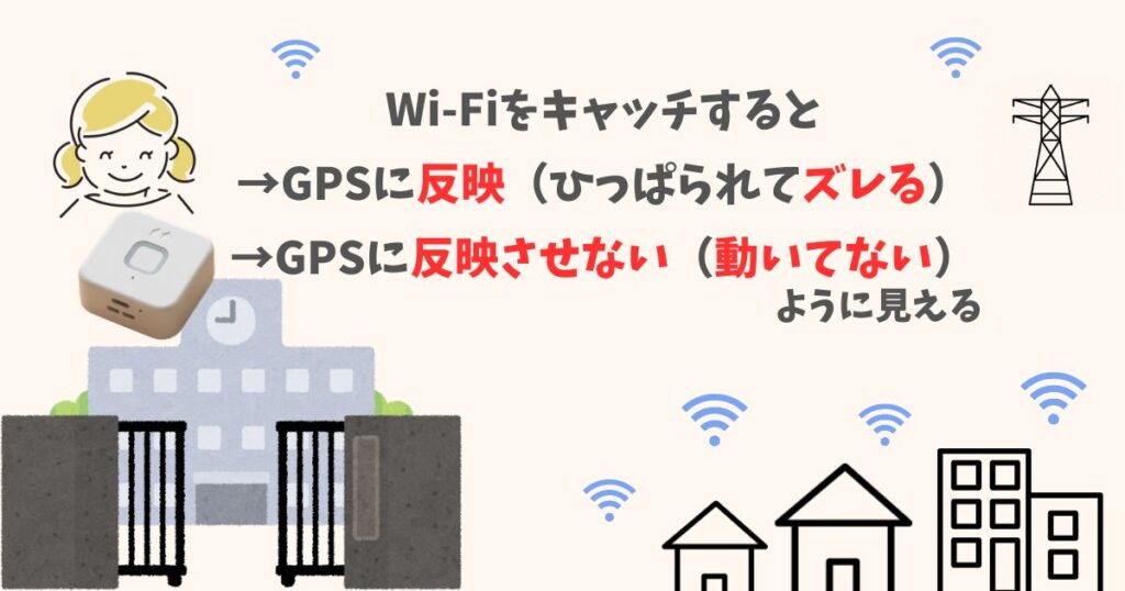 屋内や地下など電波が遮断される環境だと、微弱なWi-Fiをひろったり、離れた基地局の電波を拾おうとし、位置がずれます。