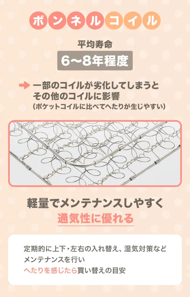 | コイルマットレス | ボンネルコイル | 3~8年 | ◎ | △ | 1万円~3万円 |