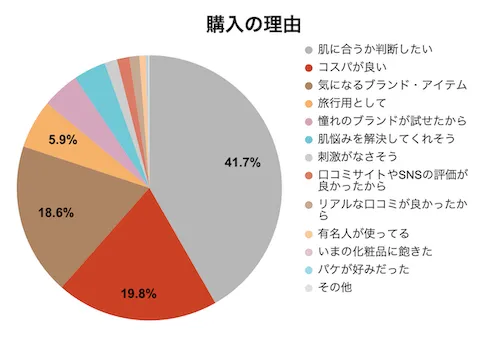 まずはじめにトライアルコスメを購入した目的を聞くと、「肌に合うかどうか判断したい」という意見が1位に(41.7%)。次いで「コスパが良い」が2位(19.8%)、「気になるブランド・アイテムが試せるから」が3位(18.6%)と続きました。