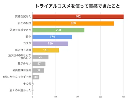 続いて「トライアルコスメを使って実感できたこと」を質問すると、「質感を試せた」が402票で最も多く、続いて「肌との相性」(359票)という結果になりました。