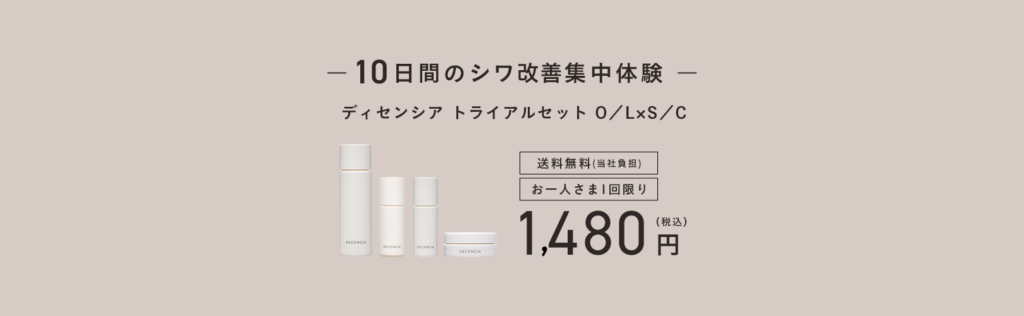 | セット内容 | ・ディセンシア ローション(化粧水) ・リンクルO/L コンセントレート(敏感肌用美容液ジェル) ・ディセンシア クリーム ・ディセンシア モイストS/C コンセントレート 【初めてお買い物をされる方の特別特典】 ・ディセンシア フォーミング ウォッシュ2包 |