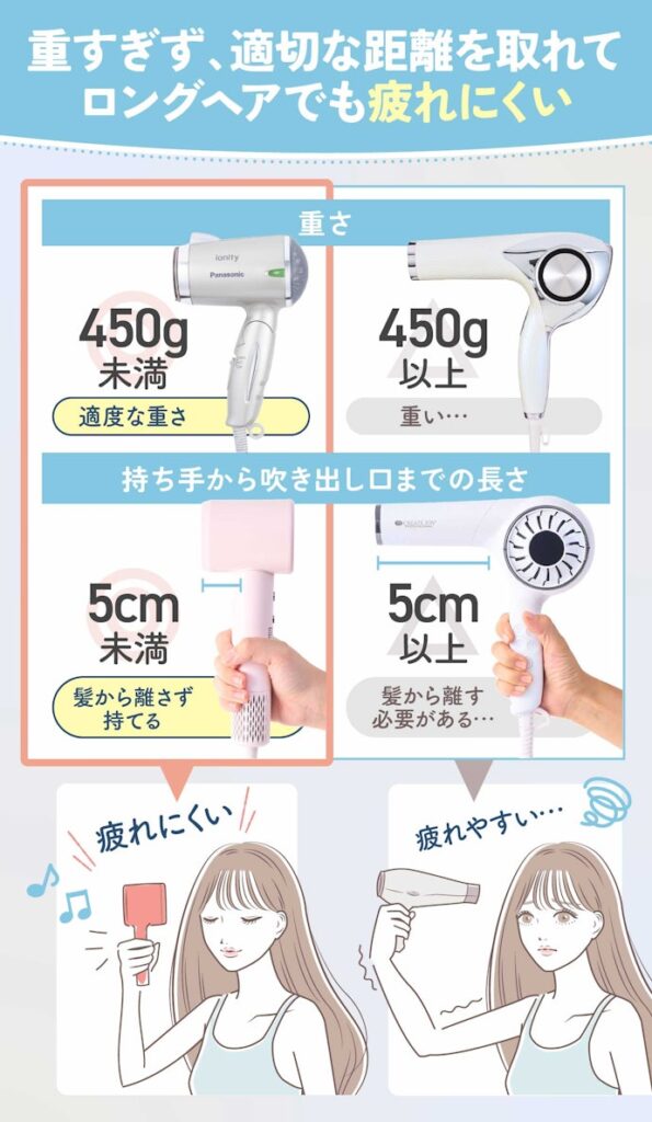 3.ドライヤーの重量は450g未満、ヘッドの長さは5cm以内が目安
