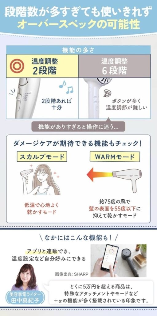 ドライヤーの温度は冷風か温風の2択、風量はSETとTURBOの2段階が一般的です。機能がありすぎてもすべてを使いきれないため、機能の数よりも使いやすさを重視するのが賢明ですよ。