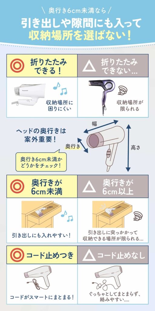 折りたためて奥行きが6cm未満なら、引き出しへの収納や旅行鞄に入れるときもかさばりにくいでしょう。本体が大きくて折りたたみ不可のドライヤーは意外と多いので、一人暮らしで洗面台が狭く収納場所に困っている人は要チェックですよ。