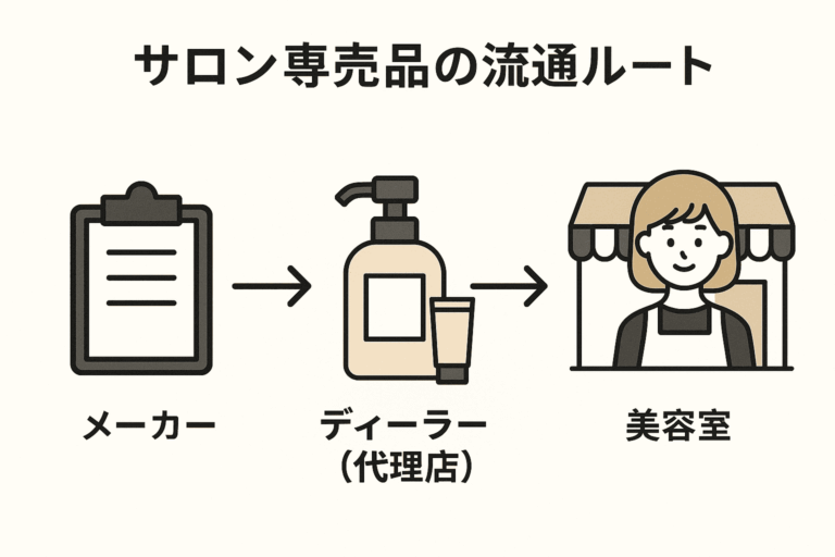 サロン専売品は通常、メーカーから卸し業者(ディーラー)を通してサロン・美容室へ流通されます(場合によってはメーカーから直接サロン・美容室へ行く場合もあります)。