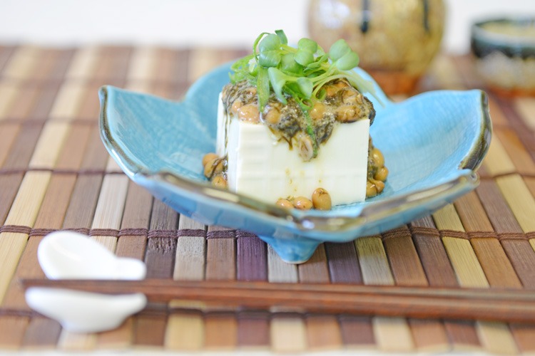 ちぎった味付け海苔を納豆に加えて、さらにかき混ぜましょう。豆腐をお皿に盛り、上から味付け海苔を混ぜた納豆を乗せます。お好みでネギなどの薬味を乗せて完成です。味が薄い場合は、醤油をかけてみてください。