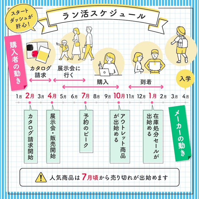 4月になると各ブランドが新作を発表し、展示会が開かれます。このあたりで百貨店や展示会に足を運び、実際に背負ってフィット感を確かめてみましょう。そして7月頃には予約のピークを迎え、人気商品に売り切れが出始めるので、4〜7月の間にランドセルを決めて購入するのがおすすめです。