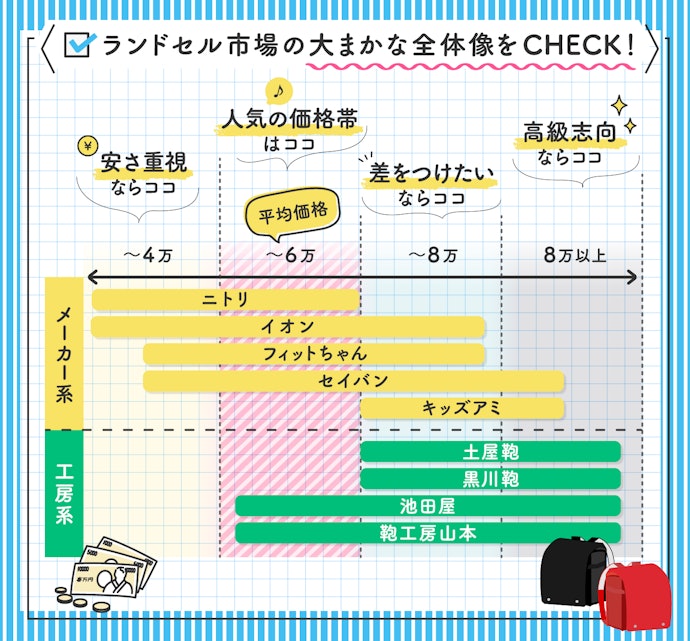 とはいえ、実際に選ぼうとするとさまざまなデザインや素材のものが存在し、どれにするか迷ってしまいますよね。まずはメーカーごとの相場と特徴を把握することで、ランドセル市場のおおまかな全体像をつかみ、どのメーカーが自分に合うか見極めるのが重要です。