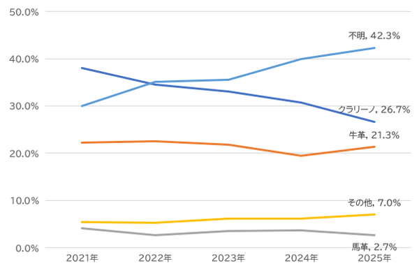 ただ、クラリーノの人気が、ここ5年で下がっていて、不明な素材が上がっています。