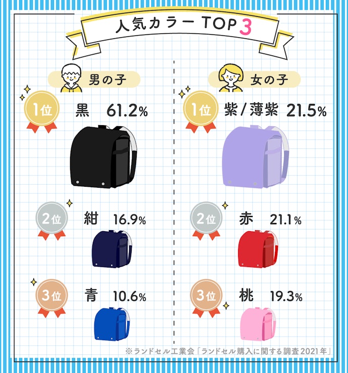 それでも色選びに迷う人や、とくにこだわりがないという人は、無難に人気色から選ぶのもあり。男の子の人気上位は「黒系」「ネイビー系」「ブラウン系」で、女の子は「ピンク系」「赤系」「紫系」です。
