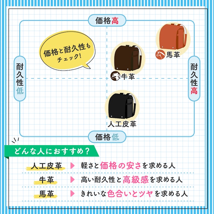 ランドセルに使用される素材は、主に人工皮革(クラリーノなど)・牛革・馬革(コードバン)の3種類。見た目の印象はもちろん、価格・耐久性・重量・質感を左右するので、それぞれの特徴を確認して自分にぴったりのものを選びましょう。