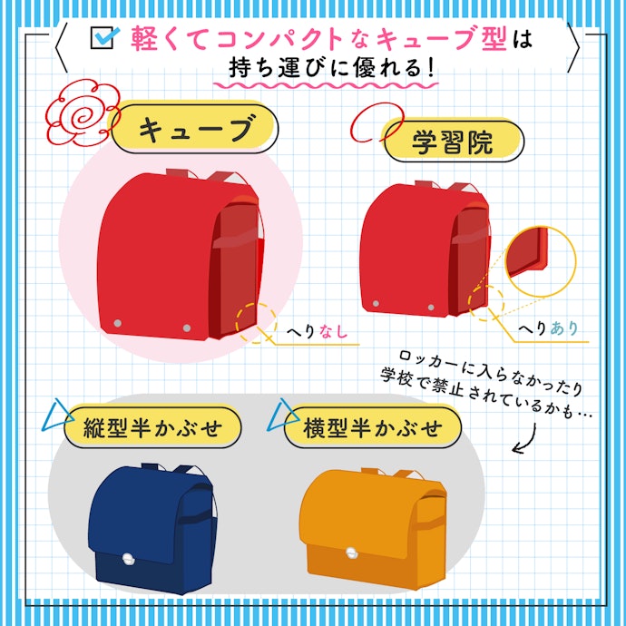 このほかには、ランドセルを立てたまま開け閉めできる「縦型半かぶせタイプ」や、大人のカバンのようにおしゃれなフォルムの「横型半かぶせタイプ」などがあります。しかし、これらは教室のロッカーによっては入らなかったり、そもそも学校で禁止されていたりするケースもあるので、購入の際は注意しましょう。