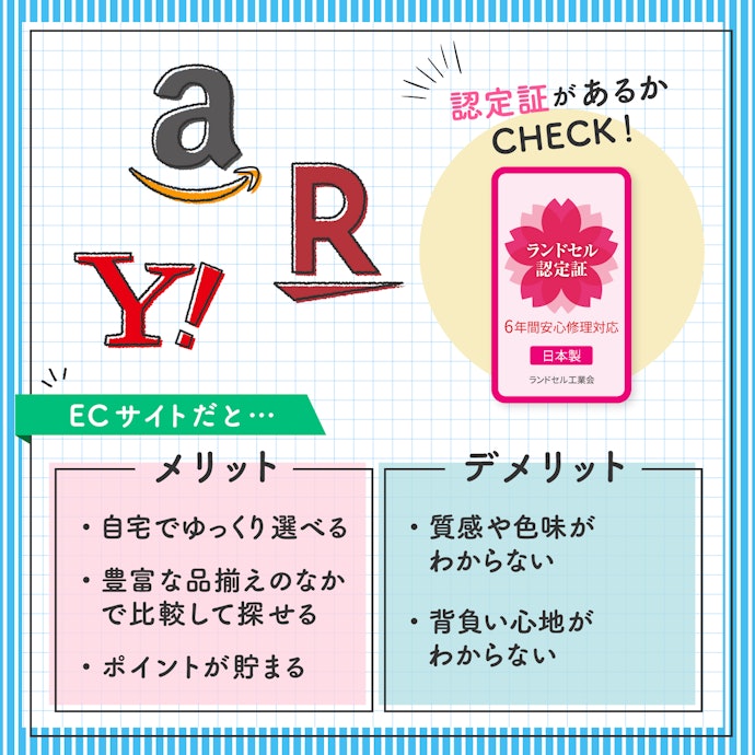 ランドセルを選ぶうえで安さを重視したい人は、Amazon・楽天・Yahoo!ショッピング・メーカー公式サイトなどのECサイトで探してみるのもあり。自宅でゆっくり選べる・豊富な品揃えのなかで比較して探せる・ポイントが貯まるなど、たくさんのメリットがあります。