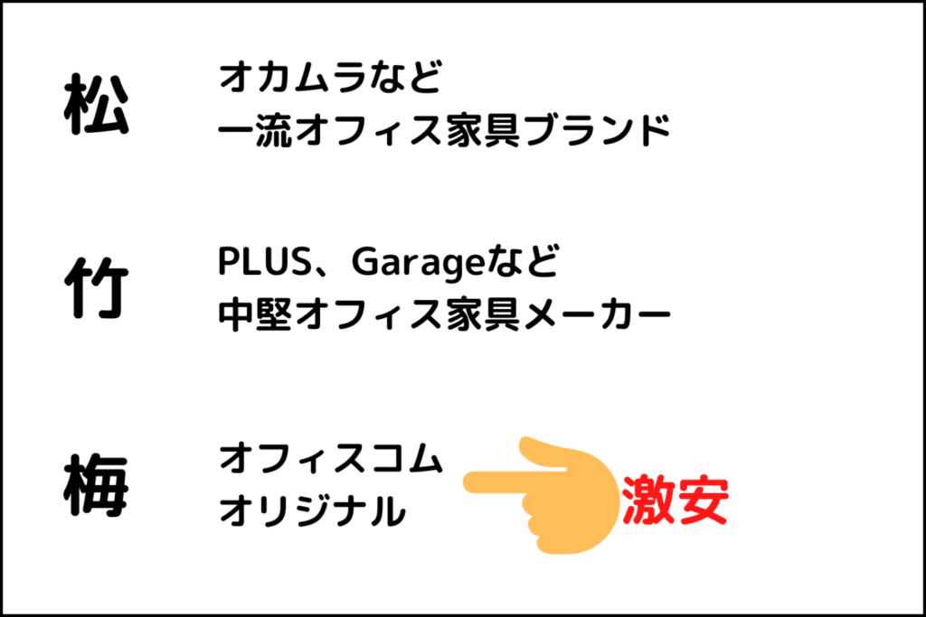 上の表のとおり、オフィスコムオリジナルと、低価格路線のメーカー両方扱うことで低価格帯のラインナップを充実させているというわけです。