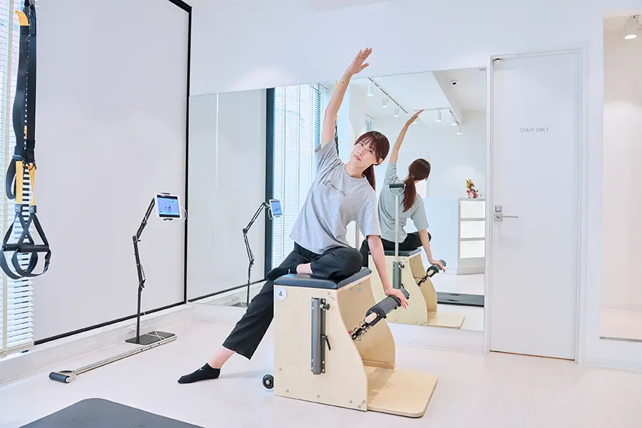 リフォーマーやチェアを使ったレッスン。身体のコアを鍛えたりストレッチなどができ、痩せやすい身体作りができる