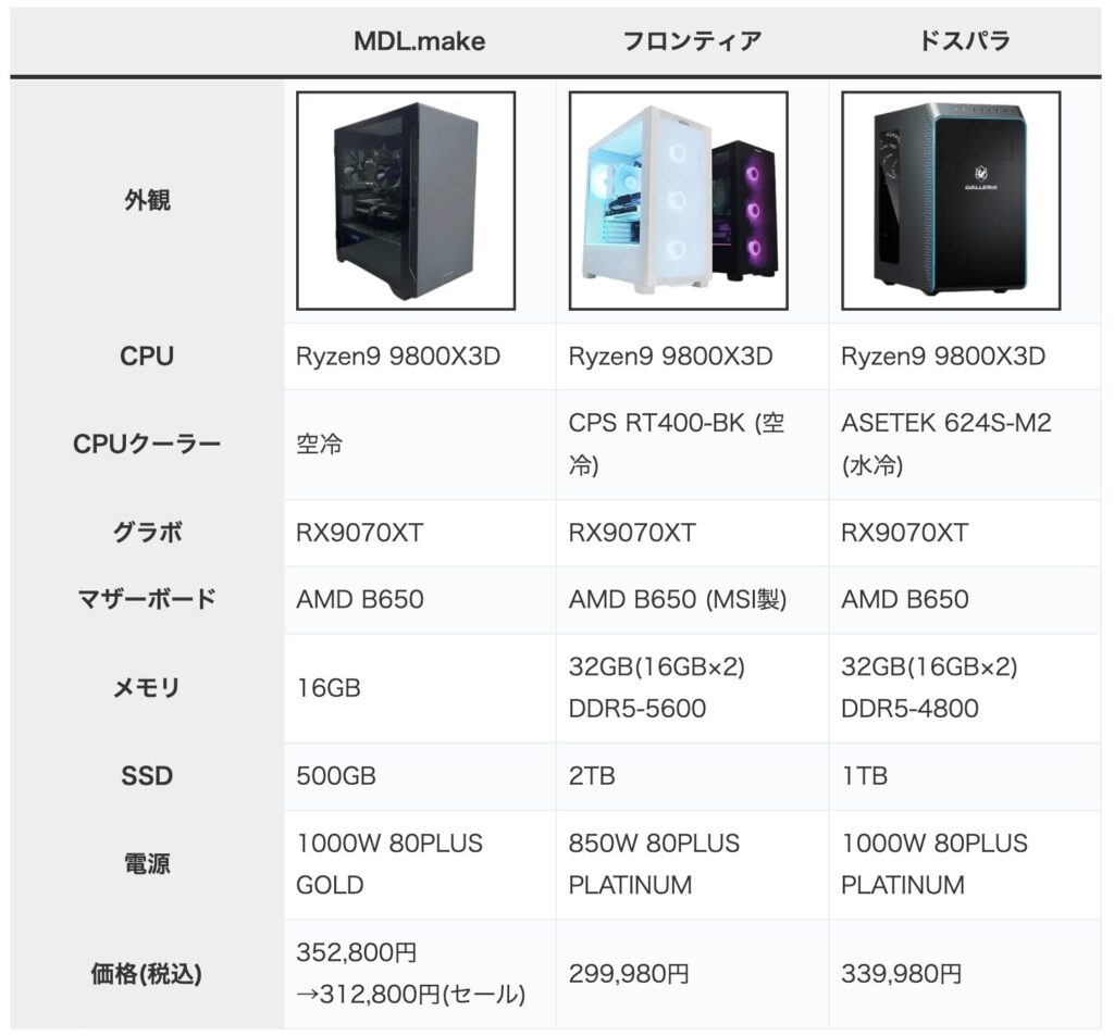 セール価格に関してはドスパラより安く、格安の部類に入ることに間違いはないが、フロンティアには及ばない。フロンティアは長年の信頼と実績があり、構成面でも価格面でもMDL.makeに勝っているというのが正直なところだ。