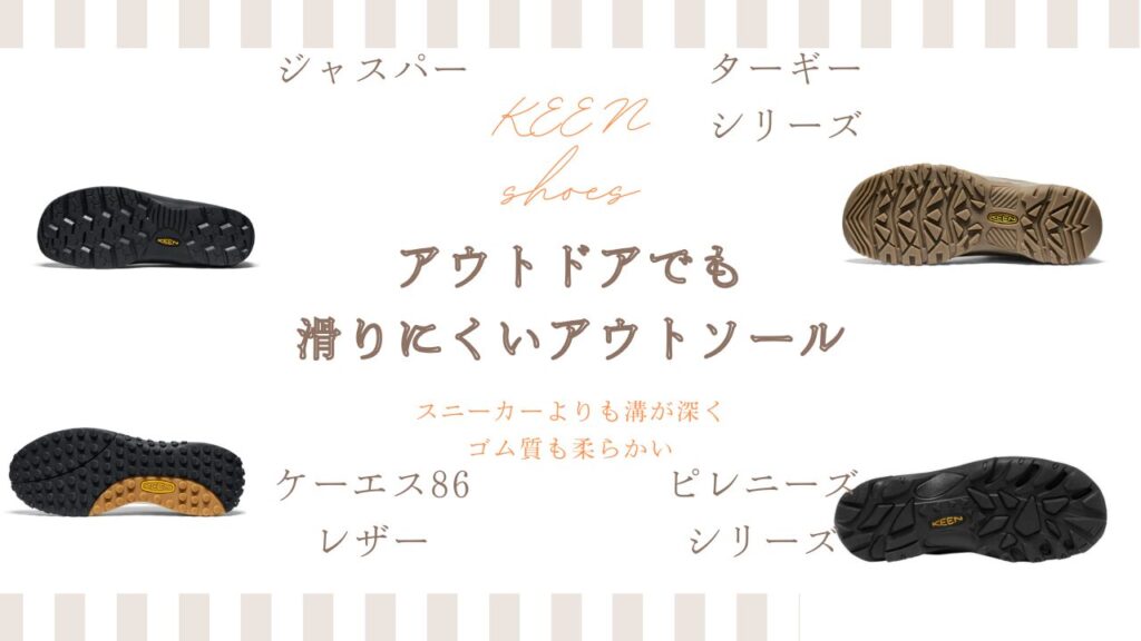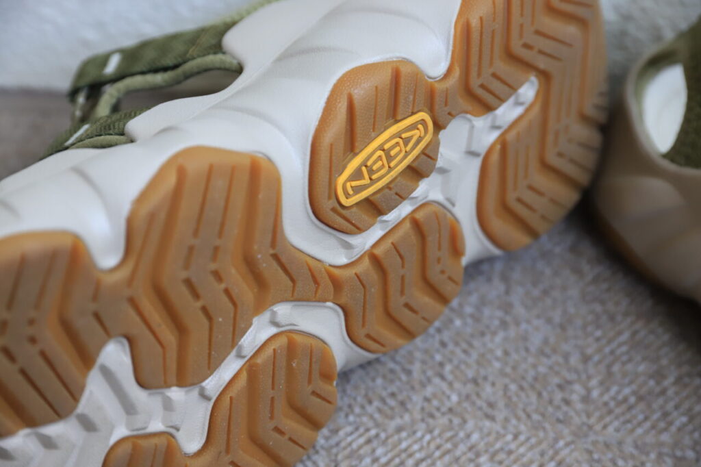 従来のKEENのシューズよりもアウトソールの減りが2倍高耐久になっており、長くグリップ感の続くモデルで、ハイキングくらいならこの靴でパッと出かけられます。