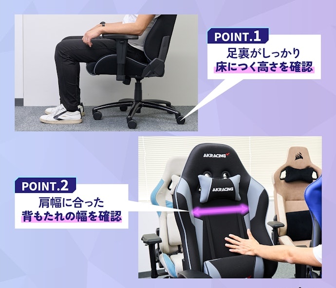 まずチェアのサイズを確認。体格に合ったチェアを選ぼう