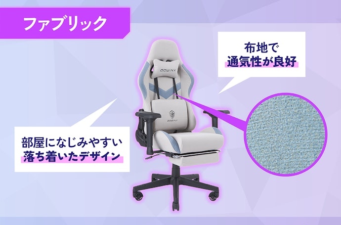 レザー素材は、ゲーミング感のあるかっこいいデザインを求める人にぴったりです。艶のある表面と引き締まった映えるシルエットが特徴で、黒や赤などのカラーリングと組み合わせると一気にスタイリッシュな印象になります。存在感があり、部屋全体をクールに見せたい人にもおすすめです。