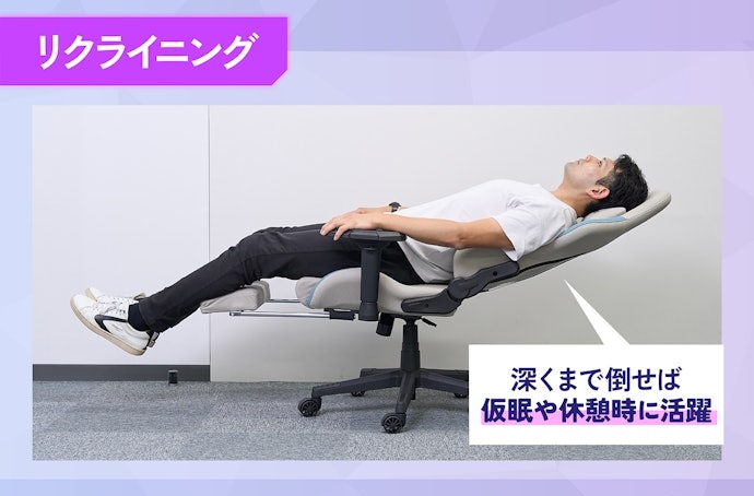 リラックスのしやすさも問題ありません。背もたれはフルフラットまで倒せるので、休憩時には体をゆったり預けてリラックスできるでしょう。一方でオットマンはなく、足を伸ばすなら別途用意する必要があります。また、アームレストの角度や前後左右の位置は調整できず、姿勢や体格にやや合わせづらい印象でした。