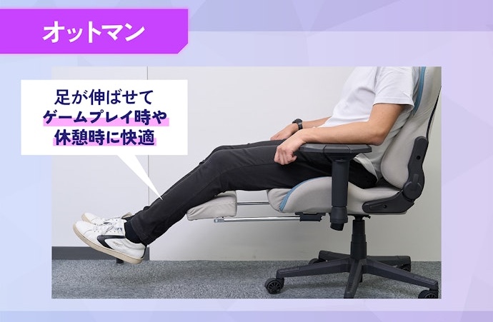 リクライニング機能は最大160度まで対応し、オットマンも付属。ゲームの合間の休憩時も、そのまま体を伸ばしてくつろげます。アームレストは高さだけでなく前後左右にも調整でき、自分好みにカスタマイズ可能。座面の奥行きは特別大きくないものの、幅が広く体格を問わず使いやすい印象です。