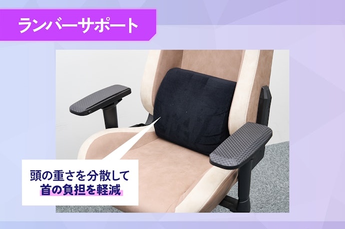 ランバーサポートは、腰の自然なカーブを支えて正しい姿勢を保ちやすくするための機能です。背中と腰のすき間をしっかり埋めることで、長時間座っても背骨がまっすぐに近い状態をキープしやすいといえます。腰への負担軽減に期待でき、疲れにくい姿勢を維持しやすいでしょう。