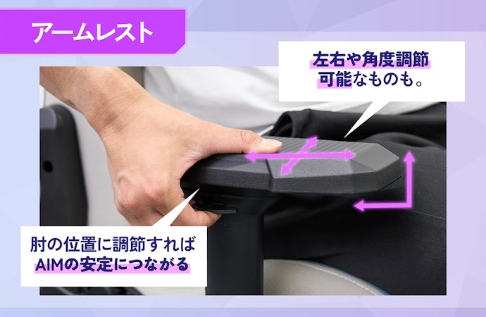 FPSなどの操作精度が求められるゲームをプレイするなら、アームレスト(ひじ掛け)の調節機能にも注目しましょう。4Dアームレストのように高さや角度、前後位置を細かく調整できるタイプなら、マウス操作時の腕の安定感が高まり、思いどおりの動きをサポートします。快適な操作環境を整えたい人は、アームレストの可動範囲をしっかりチェックしておきましょう。