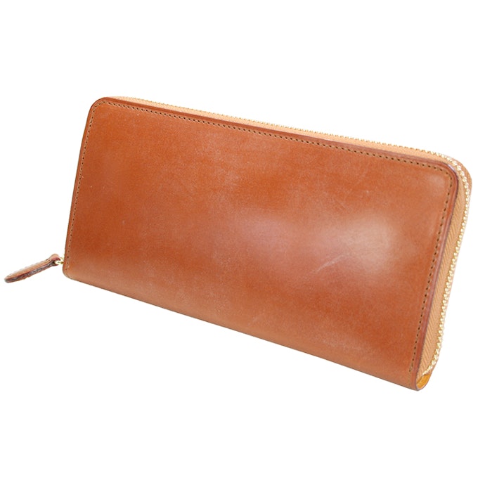 大きく開くラウンドファスナータイプで、視認性が高く、カードポケットとアオリポケットを備えた、使い勝手のよい万能長財布。J&Eセジュイック社のブライドルレザーを使用し、使い込む内に、摩擦や手のオイルによって独特の艶が現れます。自分だけのハンドグレージングによる、経年変化を楽しめるアイテムです。