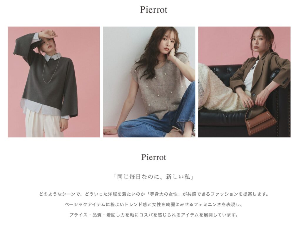 Pierrot(ピエロ)は「同じ毎日なのに新しい私」をコンセプトにした、幅広い年齢層の大人女子から人気のあるレディースファッション通販サイトです。