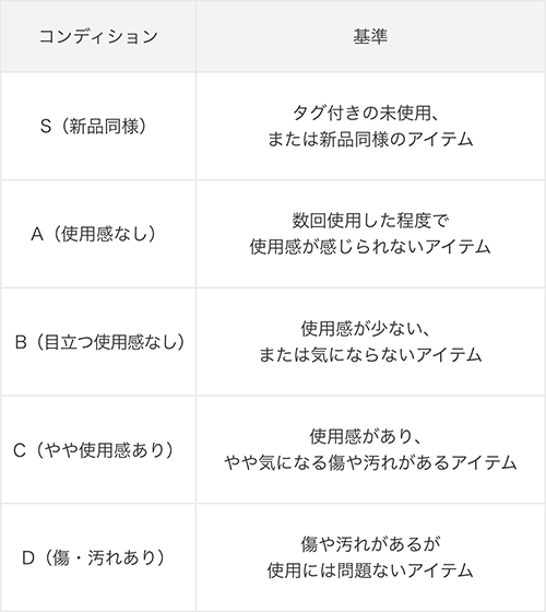 - 商品のコンディションはSランク(新品同様)からDランク(傷や汚れあり)まで明示