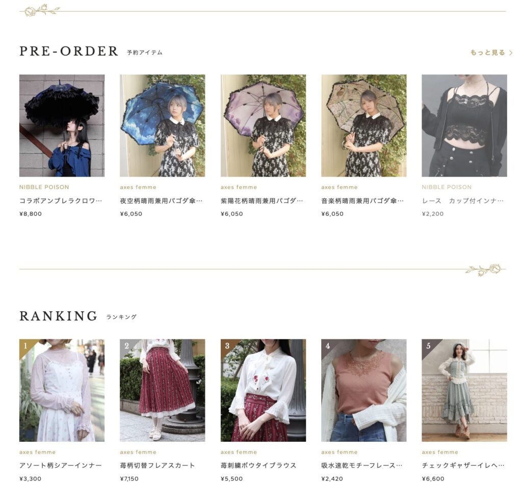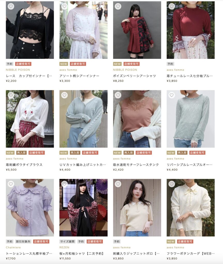 ひと目で“アクシーズっぽい”と分かるほどの、繊細なデザインや刺繍・レース使いが特徴で、街着というよりも“ちょっと非日常”なアイテムが多く揃っています。