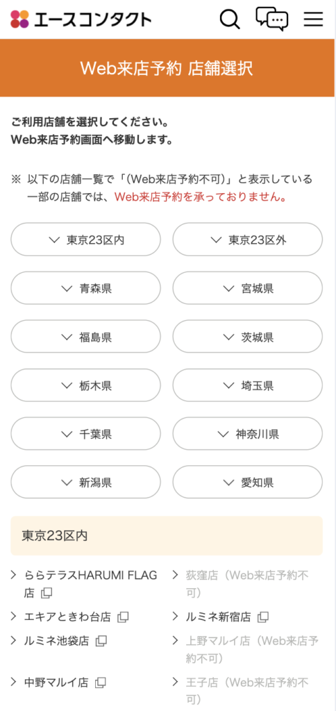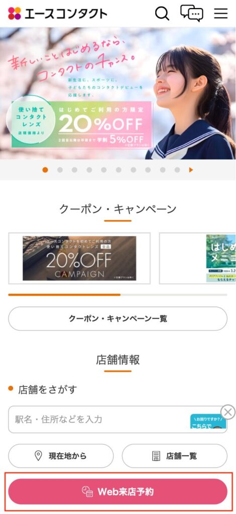 まずはエースコンタクト公式サイトにアクセスします。トップ画面にある「WEB来店予約」のボタンをタップします。