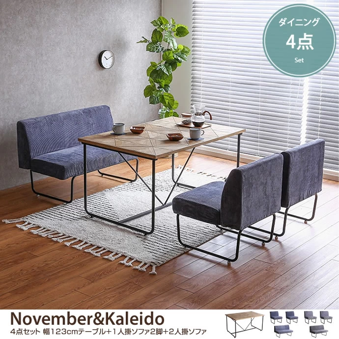 【4点セット】November&Kaleido 幅123cmテーブル+1人掛ソファ2脚+2人掛ソファ
