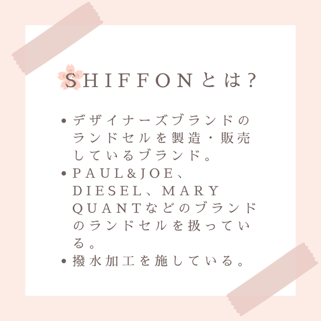 SHIFFON(シフォン)はデザインとカラーが豊富なブランドランドセルを製造・販売しています。さらに安心の6年間修理保証つきのランドセルなので安心です。